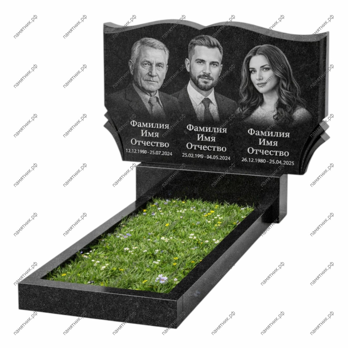 Элегантная стела с красивым фигурным навершием в форме классической волны, вершина которой смещена к правому краю. Дизайн отличается простотой и изяществом, лишен острых углов, что символизирует спокойствие, мягкость и вечный покой. Памятник объединяет память о близких людях в единый ансамбль, а высокая плотность карельского гранита гарантирует его устойчивость к любым погодным изменениям на долгие десятилетия.