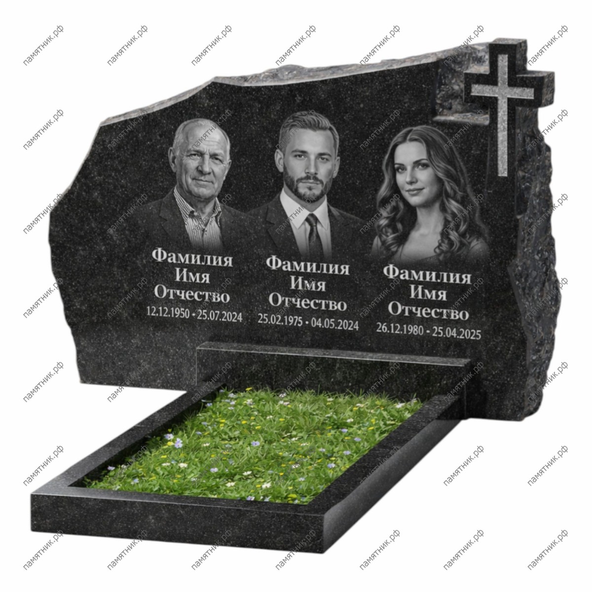 Брутальный и невероятно эффектный памятник. Левый и верхний края стелы оформлены фактурной обработкой «скала» — природным сколом, символизирующим непоколебимость, силу духа и внезапность утраты. В правом верхнем углу высечен объемный рельефный крест. Контраст между первозданной фактурой колотого камня и зеркальной полировкой лицевой стороны делает этот тройной мемориал по-настоящему эксклюзивным.
