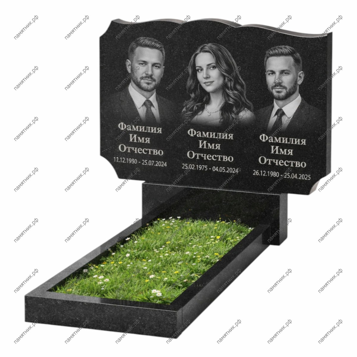Изящная модель со сложным фигурным контуром. Верхняя грань имеет мягкие волнообразные переходы, а по бокам сделаны декоративные симметричные вырезы («плечики»). Такой дизайн придает широкой горизонтальной стеле визуальную легкость и торжественность. Камень отлично поддается полировке, приобретая насыщенный черный цвет, на котором портреты смотрятся максимально реалистично.