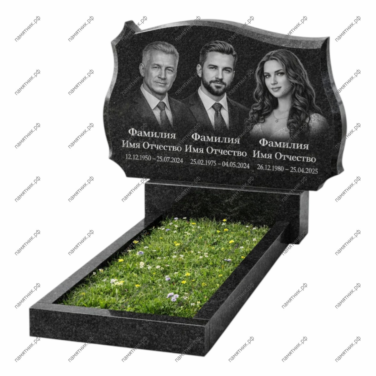 Статусный тройной памятник с выразительным фигурным контуром. Сложная геометрия верхней и боковых граней со стильными симметричными вырезами выделяет этот монумент среди классических форм, делая его по-настоящему индивидуальным. Горизонтальное расположение идеально объединяет память о близких людях в единый мемориальный ансамбль. Зеркальная полировка карельского гранита глубокого черного цвета подчеркивает благородство и строгость композиции.