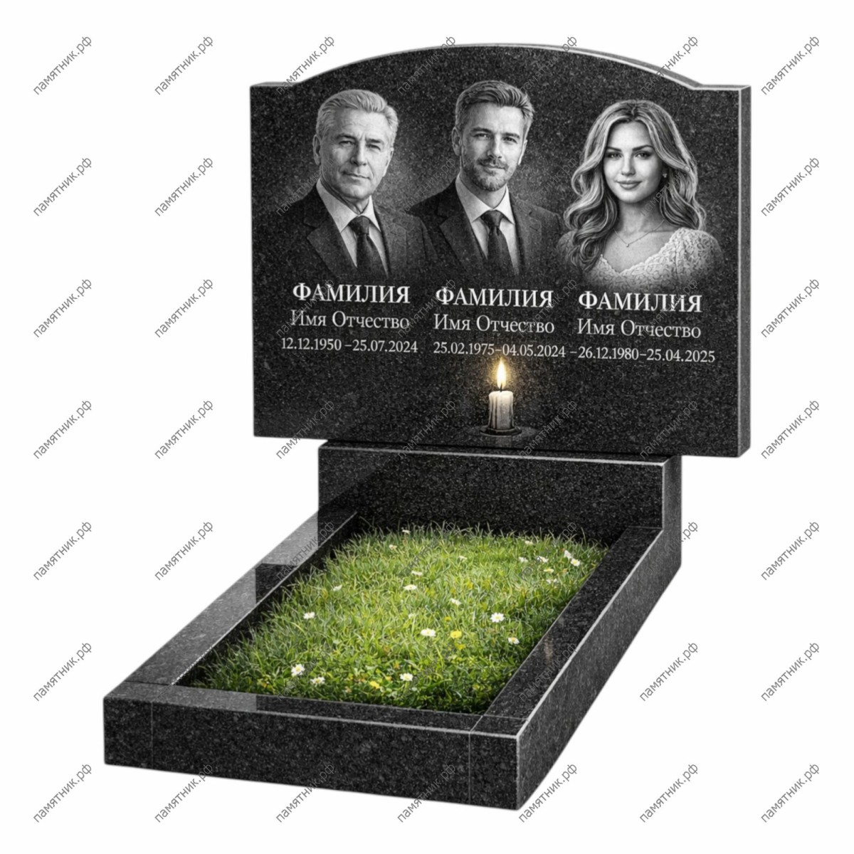 Монументальная горизонтальная стела с классическим полукруглым (арочным) завершением по центру. В нижней части памятника нанесена детализированная гравировка горящей свечи, добавляющая дизайну тепла и эмоциональной глубины. Ровные боковые грани придают памятнику строгий и монументальный вид. Высокая прочность габбро-диабаза обеспечит сохранность монумента и четкость гравировки на долгие десятилетия.