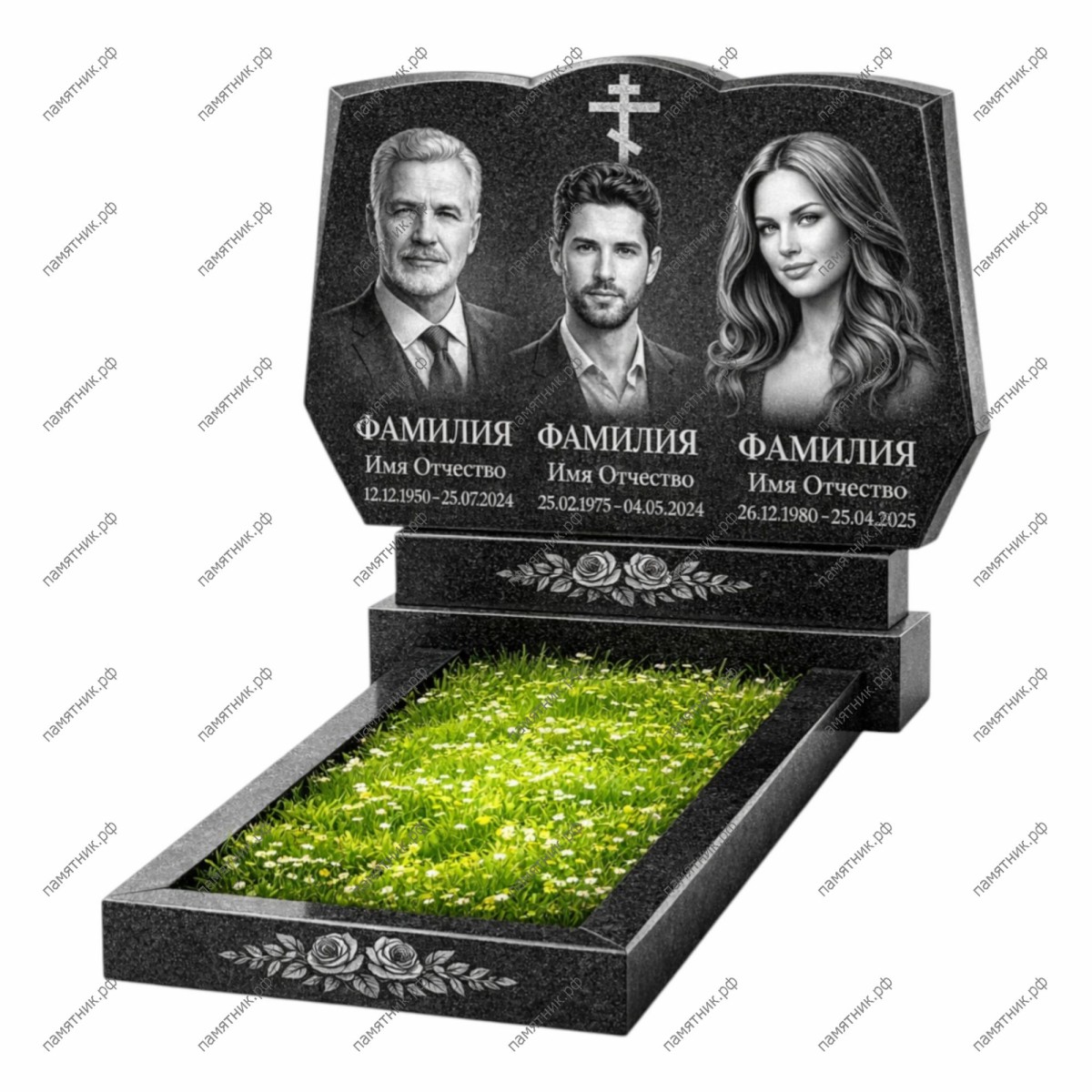 Уникальный мемориальный ансамбль с богатым художественным оформлением. Горизонтальная стела украшена фигурным резом и гравированным крестом в верхней части. Главной особенностью модели является фронтальная грань цветника, на которой искусно выгравирована роскошная ветвь роз. Этот памятник служит трогательным и долговечным символом безграничной любви, светлой памяти и крепких семейных уз.