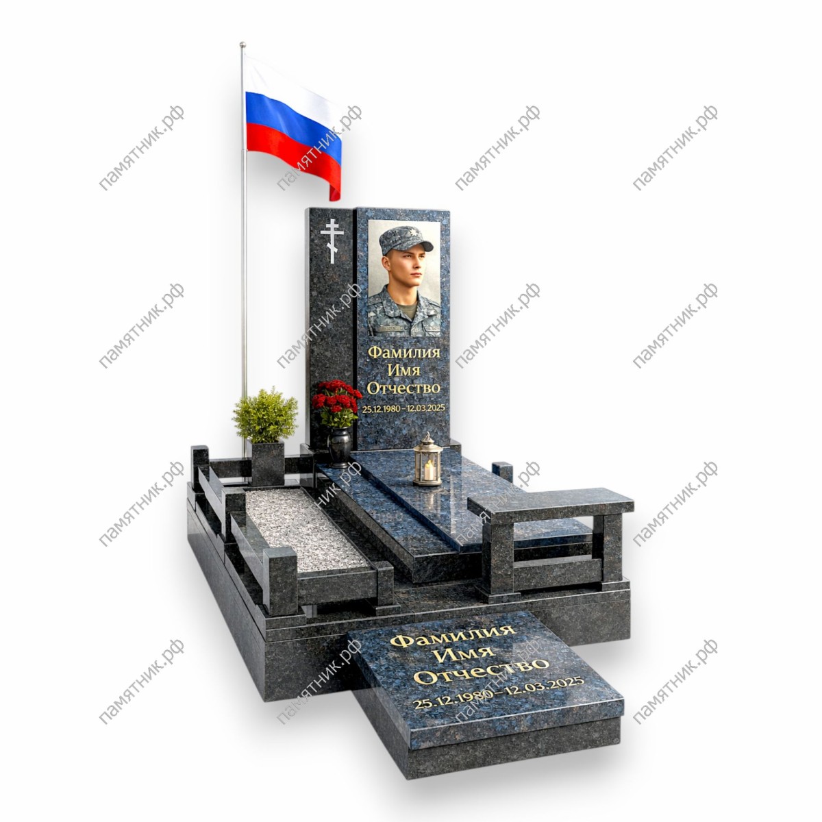 Масштабный и статусный мемориальный комплекс, выполненный из редкого синего гранита (лабрадорита) с мерцающими вкраплениями. Комплекс оснащен скамьей, флагштоком и отдельной плитой для надписей, что делает его максимально завершенным.