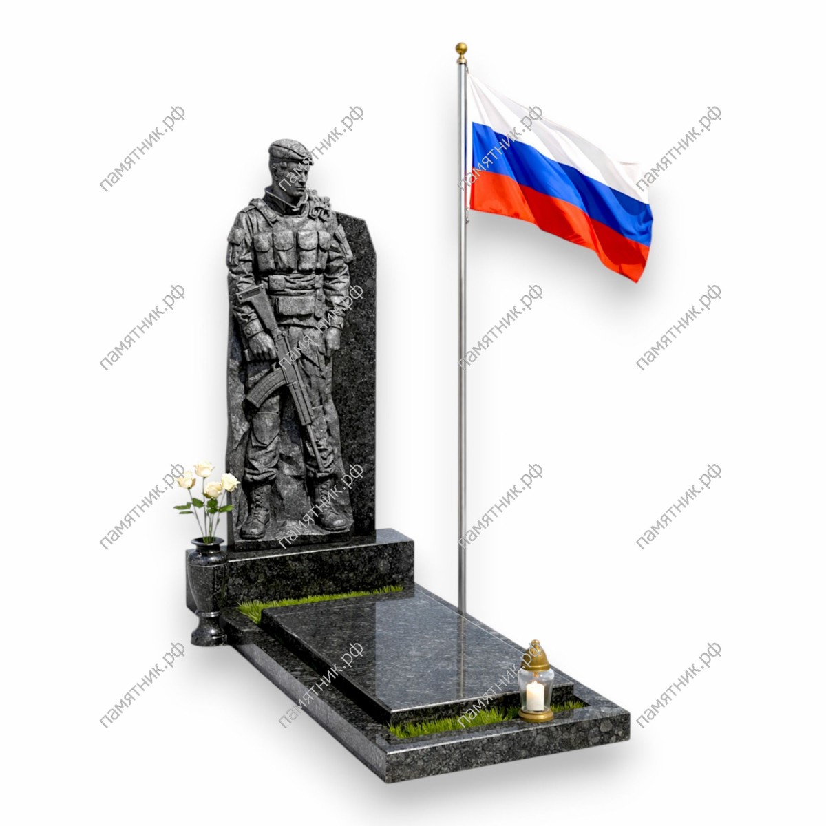Монументальный и строгий памятник, главным акцентом которого является детализированная ростовая скульптура. Лаконичное основание не отвлекает внимание от центральной фигуры, подчеркивая торжественную скорбь и мужество.