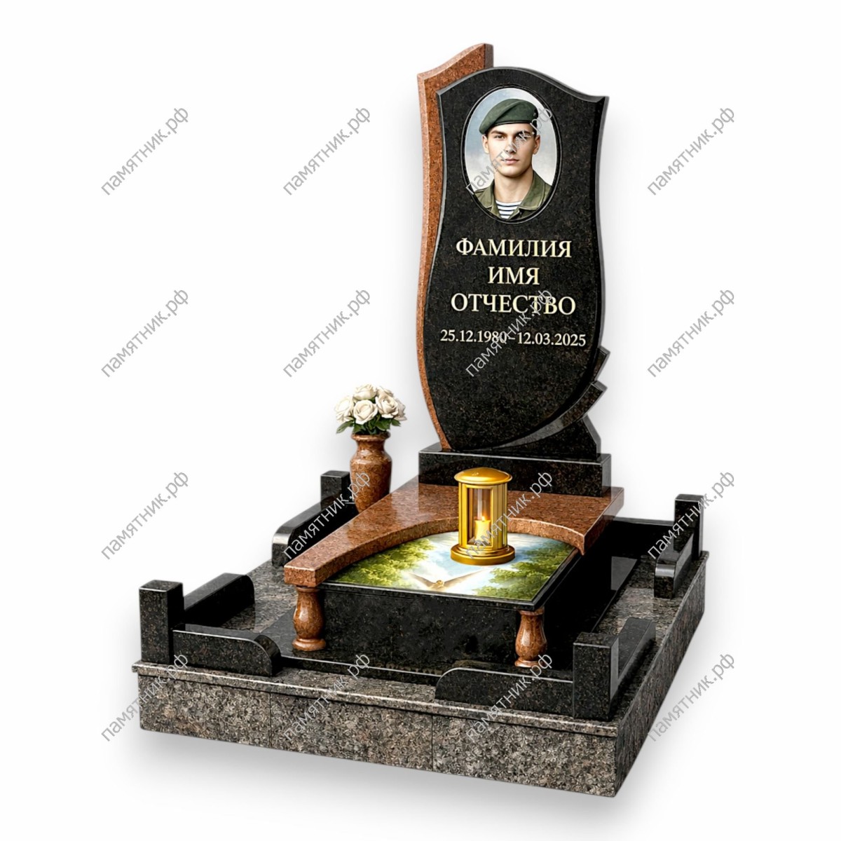 - Фигурная стела из черного гранита с подложкой из красного камня.