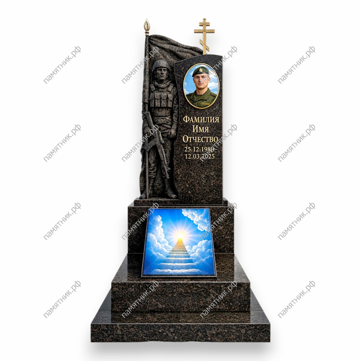 - Овальный цветной портрет, встроенный в правую часть стелы, увенчанную золотым крестом.