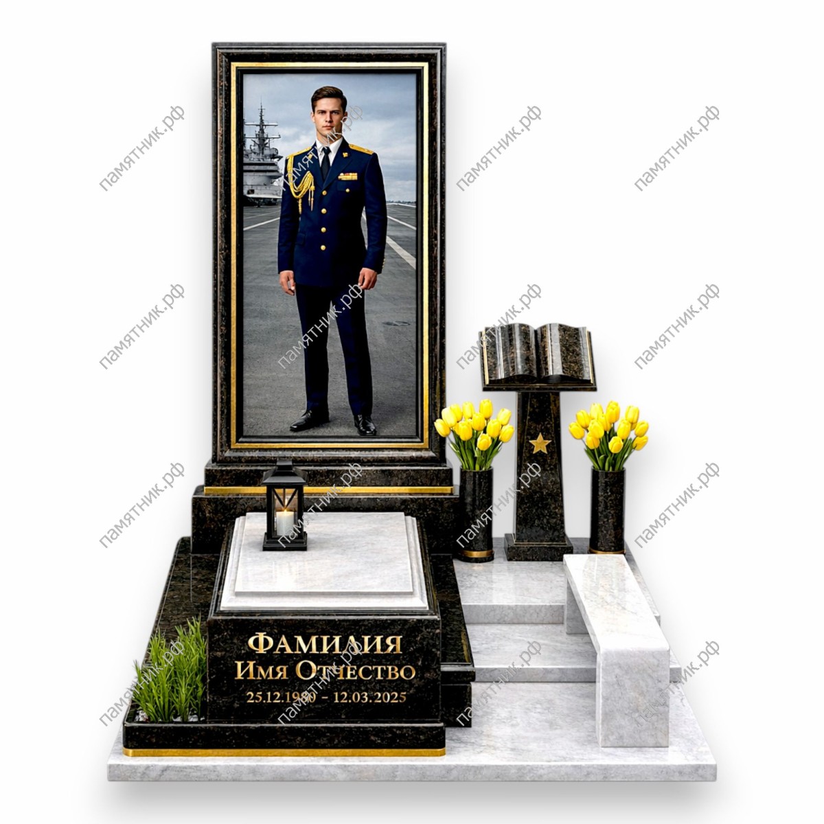- Отдельный гранитный пьедестал с искусно вырезанной раскрытой книгой.