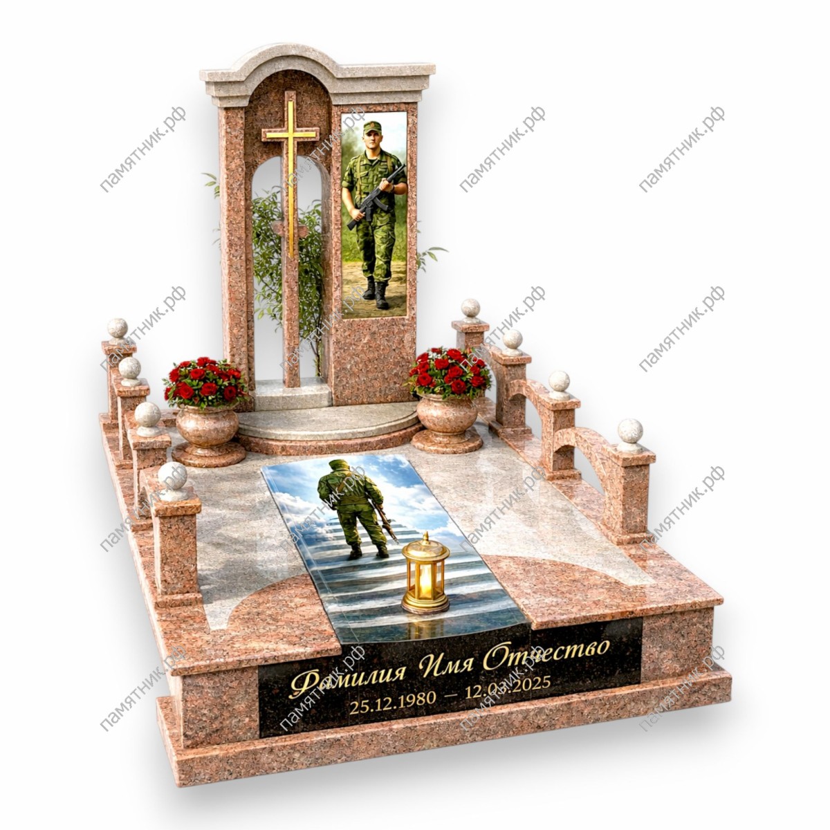 - Надгробная плита с полноцветным изображением силуэта солдата, уходящего по лестнице в небо.