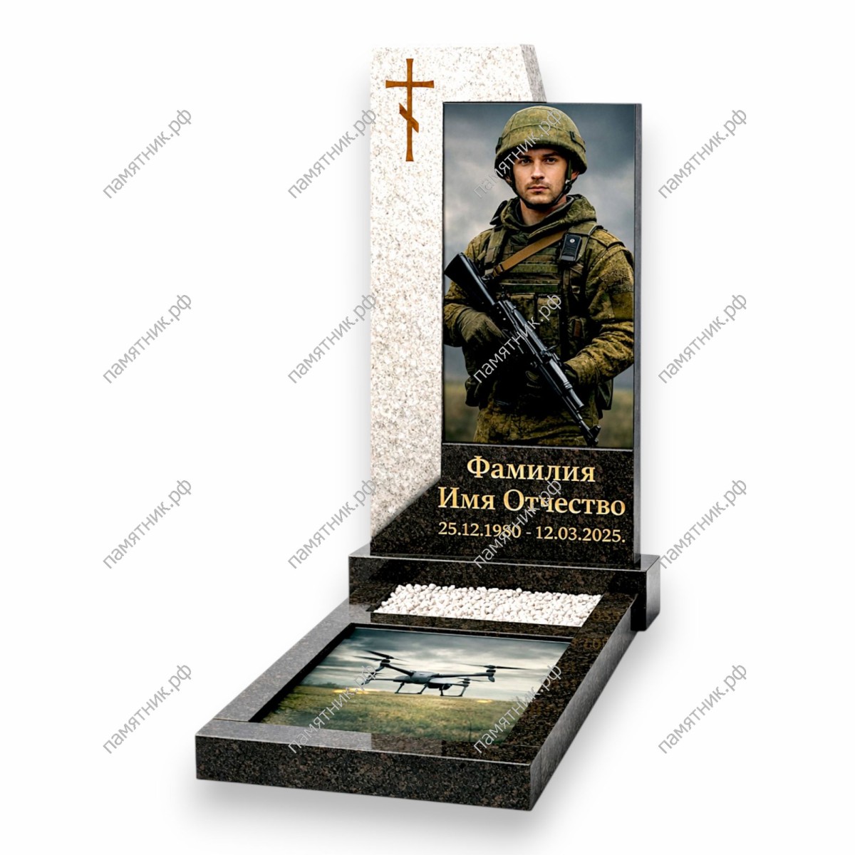 - Правая темная прямоугольная стела с реалистичным цветным портретом военнослужащего с оружием.