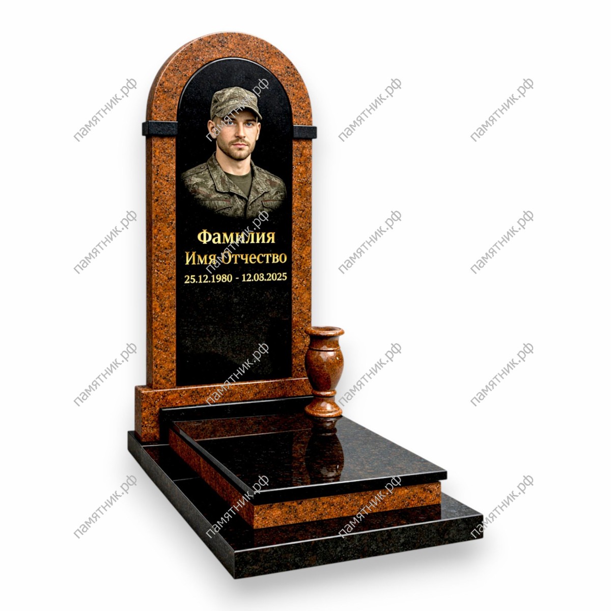 - Арочная стела из черного гранита с широким красно-коричневым кантом и декоративными темными вставками по бокам.