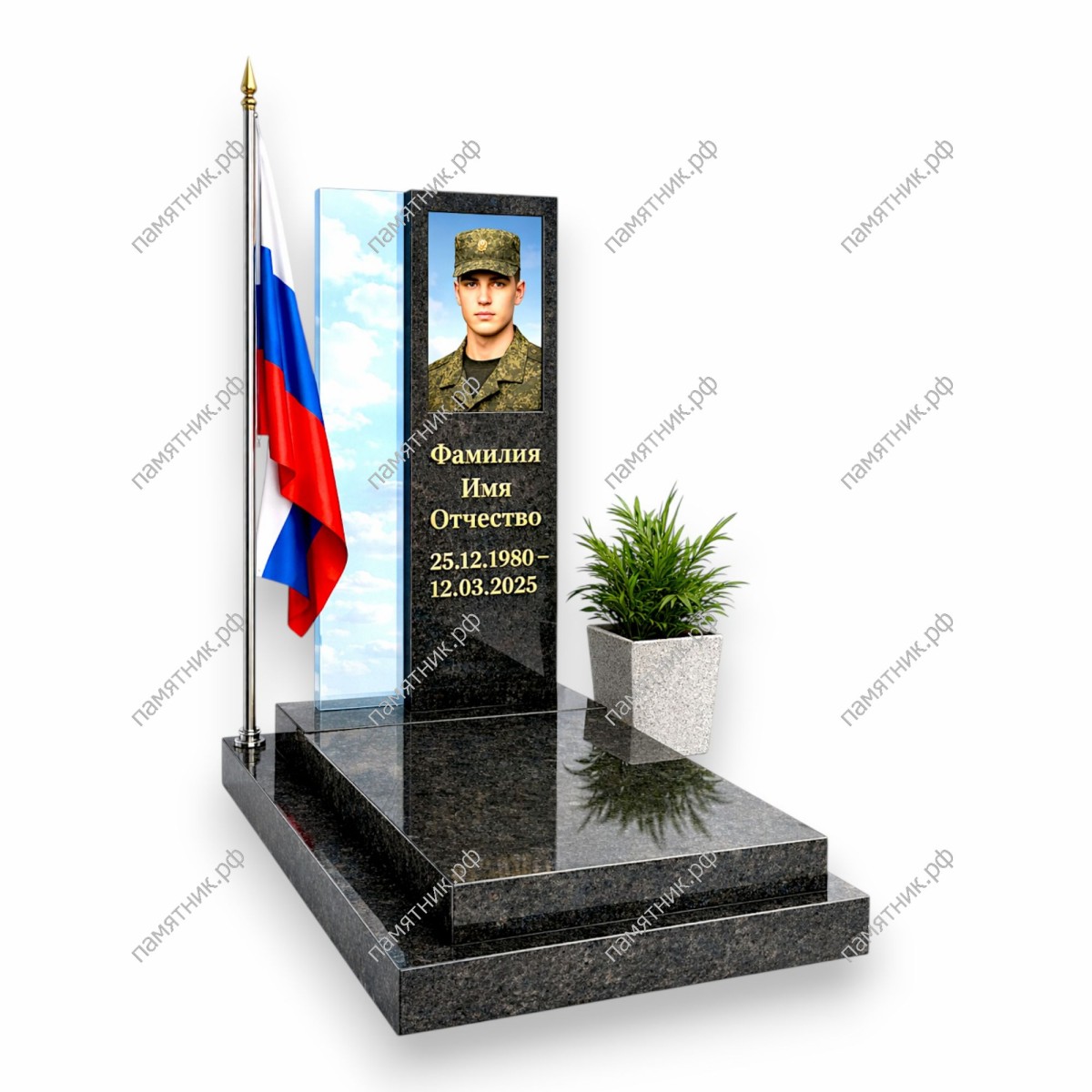 - Прямоугольная монолитная стела из черного гранита.
