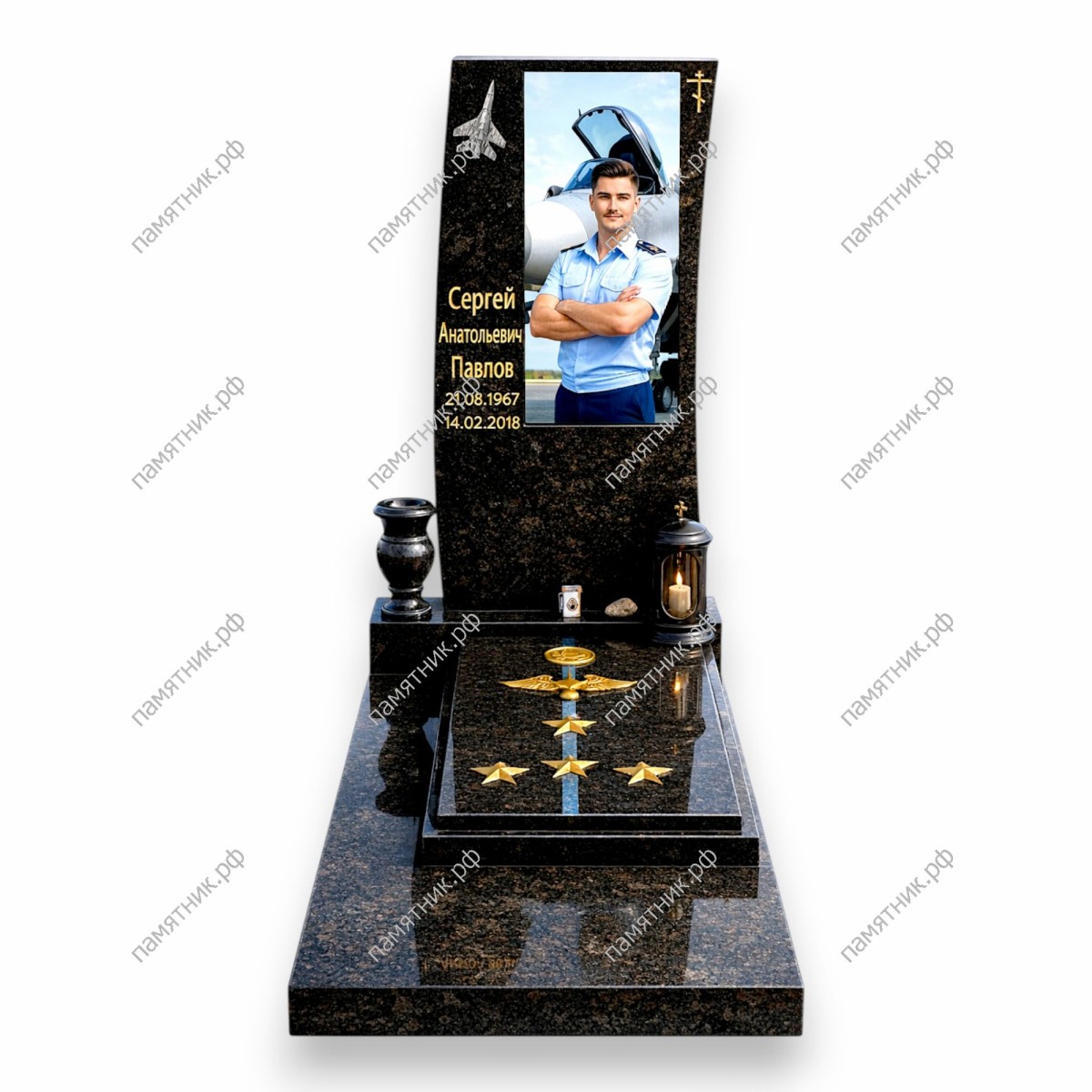 Тематический и очень выразительный мемориал, созданный специально для военного летчика или служащего ВКС. Темный гранит изящной формы с бронзовыми элементами подчеркивает статус и преданность небу.