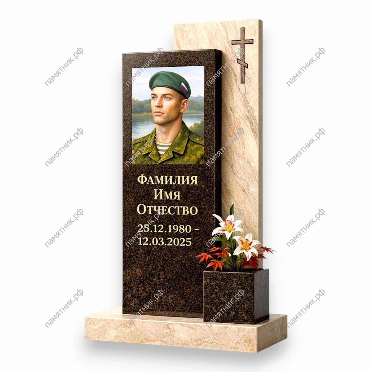 - Передняя строгая прямоугольная стела из темного гранита с классическим портретом военнослужащего.